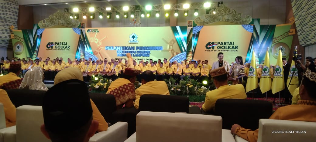 BANDAR LAMPUNG – Ketua Umum DPP Partai Golkar, Bahlil Lahadalia, resmi melantik pengurus DPD I Partai Golkar Lampung periode 2025–2030 di Ballroom Hotel Novotel Lampung, Minggu (30/11/2025) sore. Prosesi pelantikan berlangsung meriah dengan penyambutan adat Lampung, menandai dimulainya era baru kepengurusan Golkar di Bumi Ruwa Jurai.