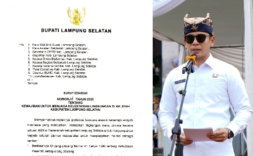 LAMPUNG SELATAN – Bupati Lampung Selatan, Radityo Egi Pratama, resmi mengeluarkan Surat Edaran Nomor 24 Tahun 2025 tentang Kewajiban Menjaga Kelestarian Lingkungan Hidup di wilayah Kabupaten Lampung Selatan.