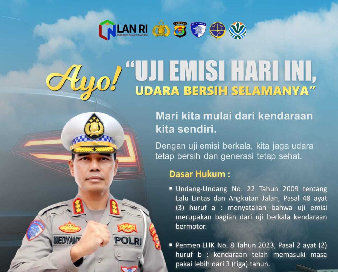 Dalam poster resmi yang dirilis Ditlantas Polda Lampung, Kombes Pol Medyanta menegaskan bahwa kendaraan bermotor merupakan salah satu kontributor utama pencemaran udara di wilayah perkotaan. Oleh karena itu, uji emisi secara berkala menjadi langkah nyata dalam menciptakan udara bersih dan menjaga kesehatan generasi masa depan.