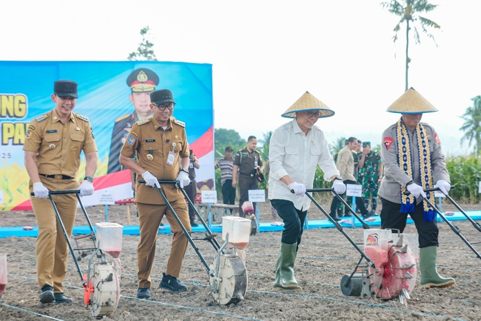 LAMPUNG SELATAN – Gubernur Lampung Rahmat Mirzani Djausal mendampingi Menteri Koordinator Bidang Pangan Zulkifli Hasan dan Wakapolri Komjen Pol Dedi Prasetyo dalam kegiatan penanaman jagung sebagai langkah memperkuat ketahanan pangan menuju swasembada tahun 2025 di Desa Pisang, Kecamatan Penengahan, Lampung Selatan, Selasa (2/12/2025).