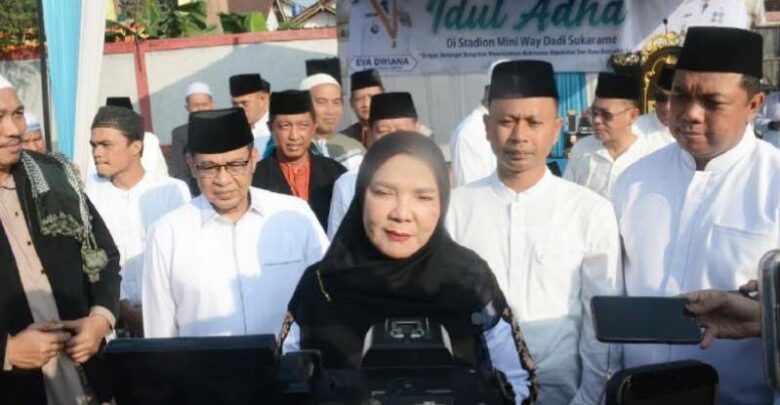 BANDAR LAMPUNG – Wali Kota Bandar Lampung, Eva Dwiana, bersama keluarga dan ratusan masyarakat melaksanakan Salat Idul Adha 1446 Hijriah, di Stadion Mini Way Dadi, Kecamatan Sukarame, Jumat, 6 Juni 2025.