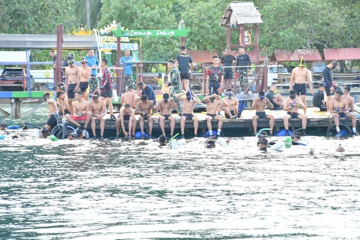 PESAWARAN – Komandan Brigade Infanteri 4 Mar/BS Kolonel Mar Supriadi Tarigan S.I.P., M.M., Memimpin Olahraga Perwira Brigif 4 Marinir/BS Wilayah Lampung dengan materi Renang Laut di Dermaga Pelangi Klara 2, Ketapang, Teluk Pandan, Pesawaran, Lampung. Selasa (15/04/2025).