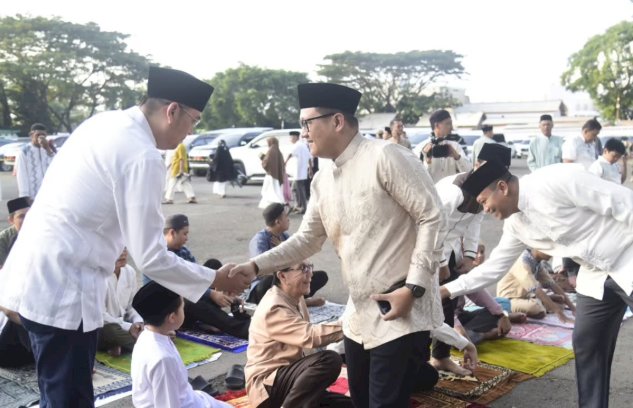 BANDAR LAMPUNG – Ketua DPRD Provinsi Lampung Ahmad Giri Akbar dan Wakil Ketua IV DPRD Lampung Naldi Rinara S. Rizal bersama Gubernur Lampung Rahmat Mirzani Djausal menunaikan Shalat Idul Adha berjamaah di Lapangan Saburai, Enggal, Bandar Lampung, Jumat (6/6/2025).