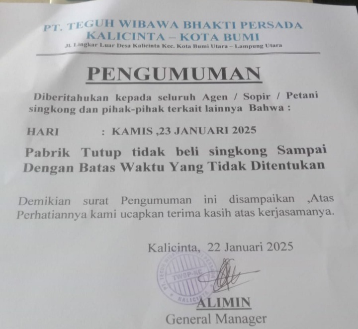 Pada pengumuman tanpa nomor surat tersebut diuraikan: Diberitahukan kepada seluruh agen/sopir/petani singkong dan pihak-pihak terkait lainnya bahwa hari Kamis, 23 Januari 2025, pabrik tutup tidak beli singkong sampai batas waktu yang tidak ditentukan. Demikian surat pengumuman ini disampaikan, atas perhatiannya kami ucapkan terima kasih.