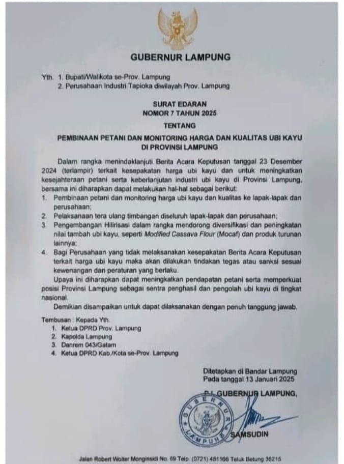 Surat edaran yang ditujukan kepada para bupati/walikota se-Lampung dan perusahaan industri tapioka di wilayah Provinsi Lampung dengan tembusan kepada Ketua DPRD, Kapolda, Danrem 043/Gatam, dan Ketua DPRD Kabupaten/Kota se-Lampung itu menguraikan, dalam rangka menindaklanjuti Berita Acara Keputusan tanggal 23 Desember 2024 terkait kesepakatan harga ubi kayu dan untuk meningkatkan kesejahteraan petani serta keberlanjutan industri ubi kayu di Provinsi Lampung, bersama ini diharapkan dapat melakukan hal-hal sebagai berikut: