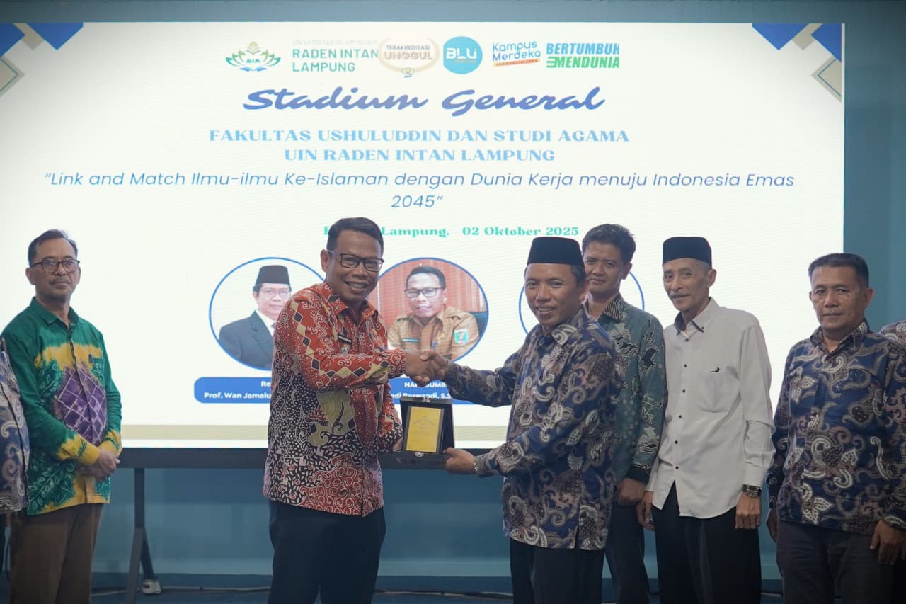 BANDAR LAMPUNG – Fakultas Ushuluddin dan Studi Agama (FUSA) UIN Raden Intan Lampung menggelar Stadium General bertema “Link and Match Ilmu-ilmu Keislaman dengan Dunia Kerja Menuju Indonesia Emas 2045” di Aula FUSA, Kamis (2/10/2025). Acara ini menghadirkan narasumber Plt. Kepala Badan Kepegawaian Daerah (BKD) Provinsi Lampung, Rendi Reswandi, S.STP., M.Si.