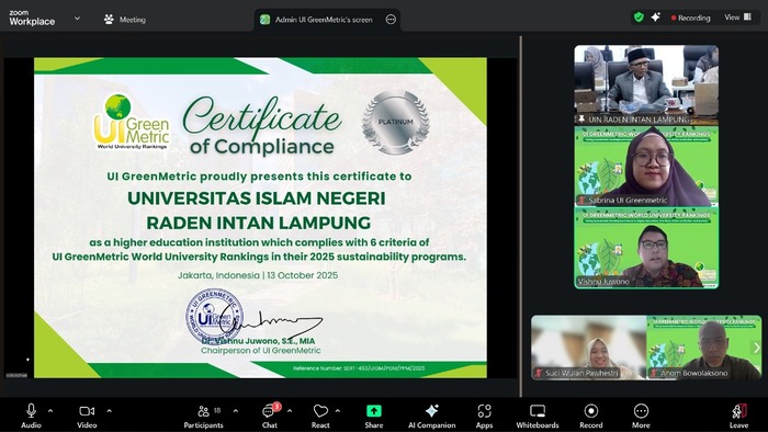 BANDAR LAMPUNG – Universitas Islam Negeri (UIN) Raden Intan Lampung (RIL) kembali mencatat prestasi dalam pengelolaan lingkungan kampus berkelanjutan. Tahun ini, UIN RIL berhasil mempertahankan Certificate of Compliance dari UI GreenMetric World University Rankings dengan nilai 4 dari 5 pohon (Trees Rating).