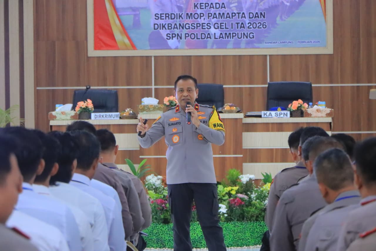 BANDAR LAMPUNG — Wakapolda Lampung, Brigjen Pol Drs Sumarto M.Si, menegaskan pentingnya kepemimpinan yang kuat, profesional, dan berintegritas saat memberikan pembekalan kepada peserta pendidikan Manajemen Operasional Polsek (MOP), Pamapta dan Dikbangpes Gel I Tahun 2026 di SPN Polda Lampung, Rabu (11/2/2026).