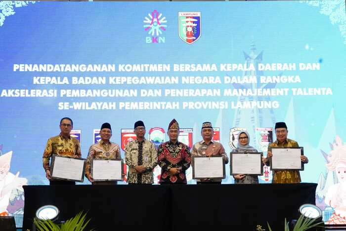 Komitmen tersebut ditandai dengan penandatanganan Komitmen Pejabat Pembina Kepegawaian (PPK) oleh Gubernur Lampung Rahmat Mirzani Djausal, Kepala Badan Kepegawaian Negara (BKN) Zudan Arif Fakrulloh, serta seluruh kepala daerah kabupaten/kota se-Provinsi Lampung dalam kegiatan Penguatan Implementasi Manajemen Talenta ASN pada Pemerintah Daerah se-Provinsi Lampung di Ruang Sapphire, Hotel Grand Mercure Lampung, Kamis (06/11/2025).